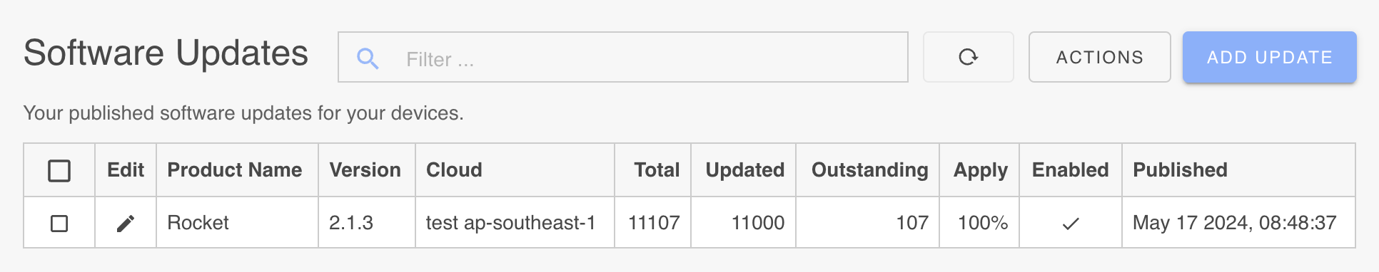Software updates are reliably stored in a device cloud and distributed globally via the AWS CDN to local regions. When defining updates, you can select your device cloud to store and manage the updates. Select the device cloud from the pulldown list. The update facility is designed to scale and will handle device populations up to and beyond 10,000,000 devices.